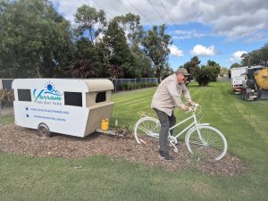 Dave with his new van outside the caravan park.